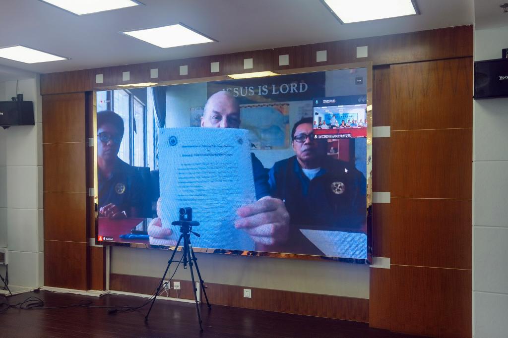 按照会议议程,吴中平校长与巴新南太平洋海事培训学院校长Gabgriel Magyari共同签署了《浙江-巴新国际海事学院巴新高级船员培养备忘录》。