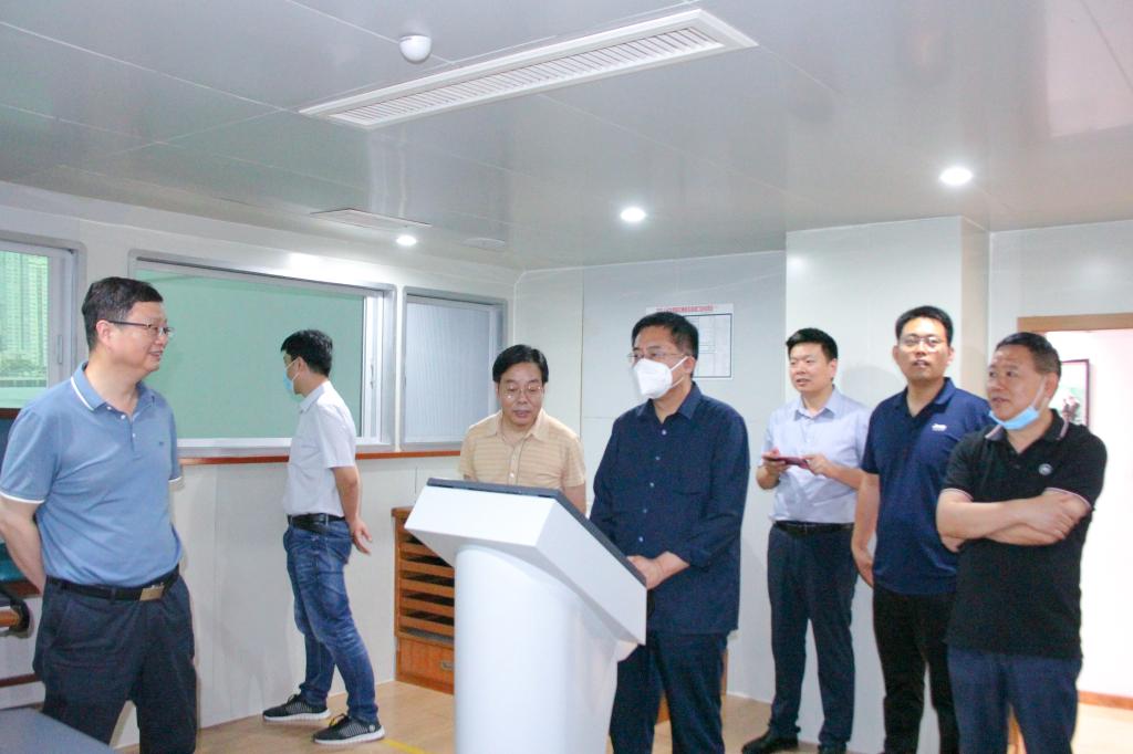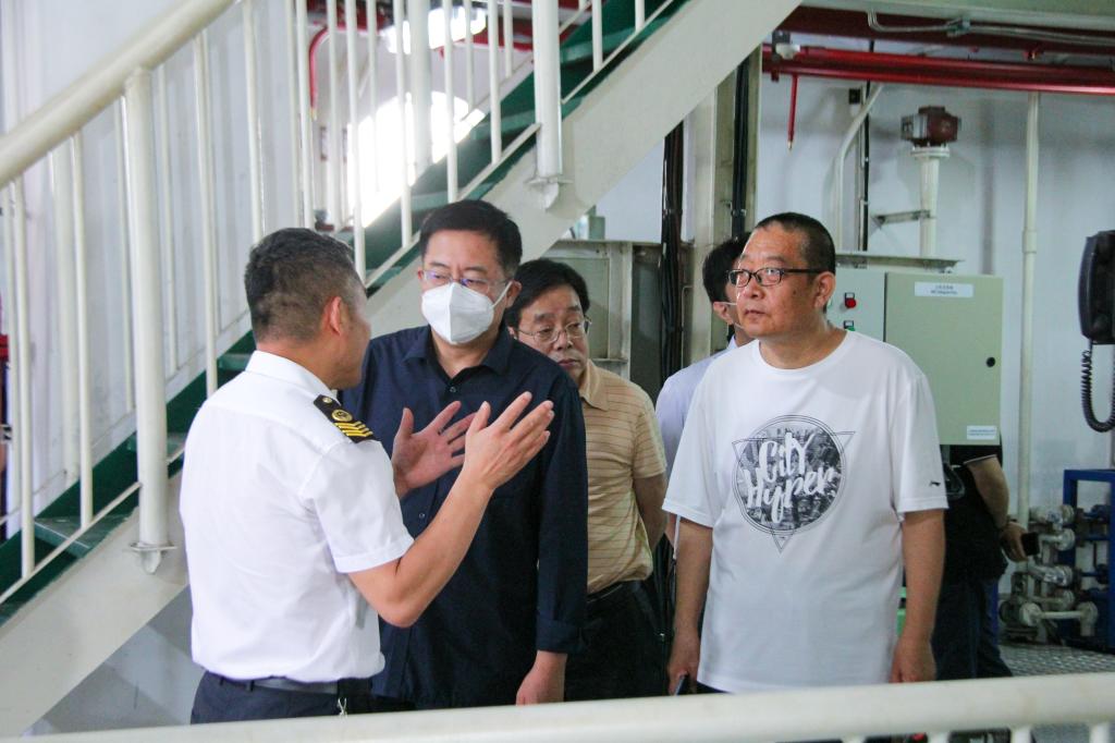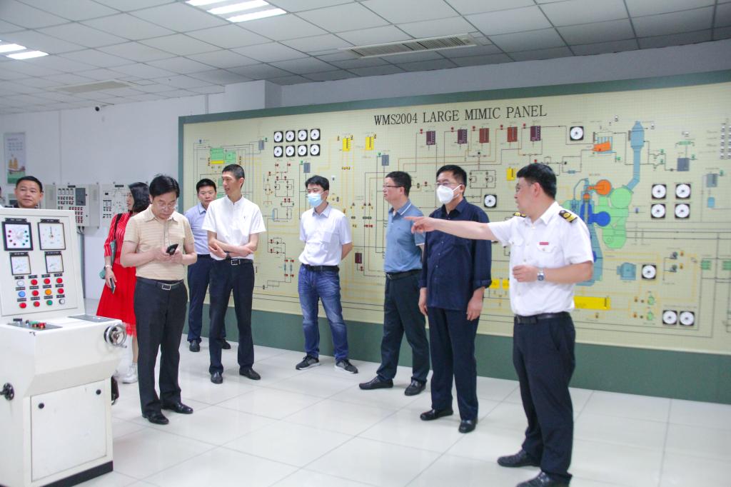杨宝森一行参观了学校船舶知识馆、自动化机舱、航海驾驶操纵模拟器、轮机模拟器、海邮驿站等实验实训室,了解学校实验实训室建设、师资队伍建设、校企合作、产教融合、人才培养等方面情况。