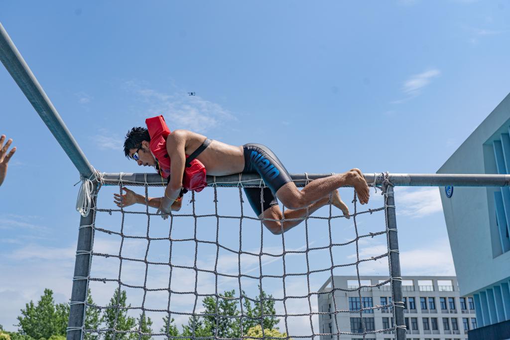 铁人三项接力是大比武中最具观赏性、竞技性和实用性的赛事。每支参赛队派出5名选手进行游泳50米、拖带15公斤重的模拟溺水橡皮人回游50米和攀越救生绳网三个项目接力,拼的是选手们的体力和毅力。此起彼伏的呐喊声、欢呼声中,18支航海院校队的选手们在水中奋勇争先,上演了一场场争分夺秒的“海上救援”。经过激烈的角逐,大连海事大学、江苏航运职业技术学院、上海海事大学摘得比赛院校组的冠亚季军,我校获得了院校组第9名的好成绩。