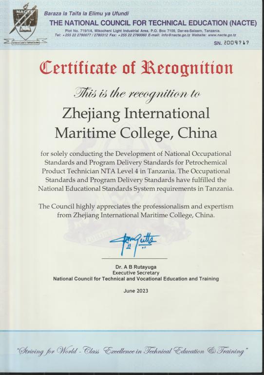 20236月,由我校主持、参与的坦桑尼亚职业标准和配套专业教学标准轮机工程技术员4级、轮机工程技术员6级、船舶电子电气技术员4级、船舶电子电气技术员5级、船舶电子电气员6级、石油化工产品技术员4级等6个项目获得坦桑尼亚国家教育委员会认证,正式纳入坦桑尼亚国家职业教育体系。