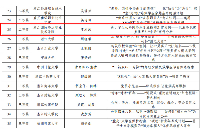 近日,由浙江省教育厅、浙江省高等教育学会等主办的第六届浙江省高校辅导员工作案例大赛公布评审结果,我校辅导员李沛沛的题为《关于学生从事网络娱乐主播的工作案例——以浙海职院直播网红“小丹”事件分析》的工作案例在全省444篇工作案例中脱颖而出,获得二等奖,取得了该项比赛零的突破。(学工部)