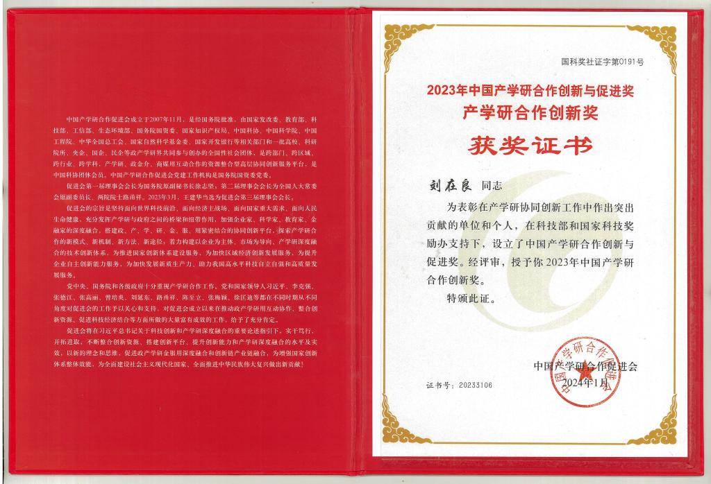 “中国产学研合作创新与促进奖”是经国家科技部和科技奖励工作办公室批准设立、由中国产学研合作促进会组织实施、面向我国产学研界协同创新的最高荣誉奖,旨在推动产学研深度融合,鼓励和表彰在推动政产学研金服用协同创新工作中做出突出贡献的先进单位和个人。“中国产学研合作创新与促进奖”分设产学研合作突出贡献奖、产学研合作创新奖、产学研合作促进奖、产学研合作创新成果奖、产学研工匠精神奖五个不同特色的奖项。2023年全国共有23所高职院校获奖,其中产学研合作创新奖旨在表彰在工作中勇于创新、勇于实践,推荐产学研用深度融合方面成效显著的单位或个人,我校刘在良教授是全国高职院校中获中国产学研合作创新奖(个人)的其中2位之一。