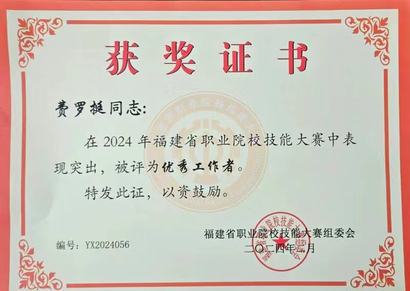 在近日落幕的2024年福建省职业院校技能大赛中,我校海洋装备工程学院的费罗挺老师因其出色的执裁表现获评“优秀工作者”。