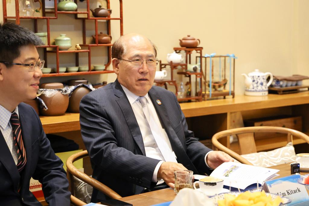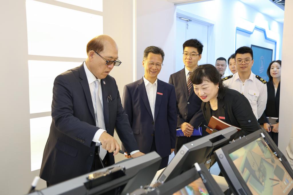 林基泽先生此行来舟山参加由浙江大学承办的“第六届长江经济带研究与创新联盟国际学术会议”,在了解到我校的航海教育和办学特色后,受邀来我校访问。林基泽先生参观了我校航海操纵模拟器、国家级航海虚拟仿真中心、轮机模拟器、邮轮实训室等教学实训场所。