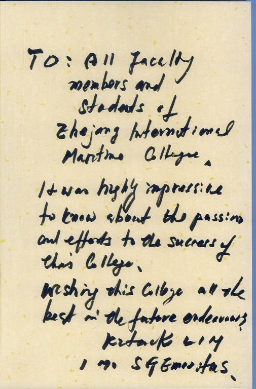 会谈结束后,林基泽先生热心为我校师生亲笔题词,希望我校要始终坚持“面向世界”的国际化办学定位,努力践行培养高素质国际船员的责任与使命,办成一所具有国际影响力的高水平院校。(航海工程学院、致远创业学院、办公室)