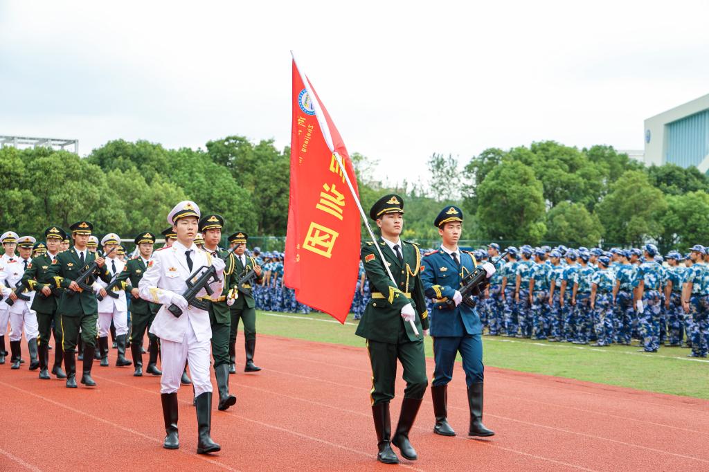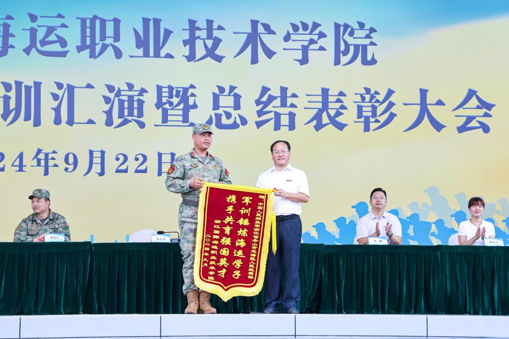 孔志光副书记向承训教官们赠送锦旗,向承训单位定海区人武部对我校国防教育工作给予的大力支持表示感谢。他对2024级全体参训同学顺利完成军训任务表示祝贺,并对新生军训取得的成效表示肯定。他指出,军训是一门特别的课程,是新生进入大学的第一课。通过军训,同学们领略了军人的风采,强化了国防意识,增强了爱国热情;增强了体质,磨练了意志,培养了团结协作精神,形成了良好的组织纪律观念;增强了集体凝聚力,形成了积极向上的良好班风,实现了军训是学校人才培养有机组成部分的教学目标。他勉励同学们要将军训的收获化为成长的动力,把养成的良好作风、严明纪律和意志品质带到今后的学习生活中,以昂扬姿态践行“请党放心,强国有我”的使命担当,努力成长为有理想、敢担当、能吃苦、肯奋斗的新时代好青年。
