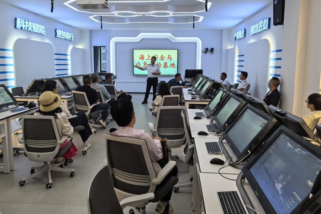 学员们首先来到水上训练中心,了解各类水上救援设备及训练流程,对水上安全保障体系有了初步认识。在航海模拟器与游艇模拟器区域,通过模拟驾驶体验,学员们亲身感受了航海操作的复杂性与重要性,沉浸式地学习航海知识与技巧。随后,学员们走进国家级现代航运虚拟仿真中心,先进的虚拟技术展示了航运过程中的各类场景及应急处置方式,拓宽了大家对海上安全应急的视野。参观结束后,双方就海上安全知识普及、应急技能培训等方面的社区教育工作展开座谈,交流经验与想法。