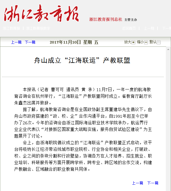 11月7日,一年一度的航海教育咨询会在杭州举行,“江海联运”产教联盟同时成立。省教育厅副厅长朱鑫杰出席并致辞。