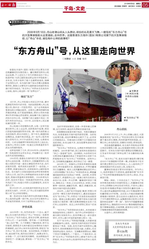 2006年9月18日上午,舟山老塘山港区,大型集装箱货轮“东方舟山”号在缤纷的礼花中缓缓摘下喜庆的红绸缎,热烈的掌声阵阵响起,这一艘以舟山命名的巨轮,迎着东方骄阳,即将远航。