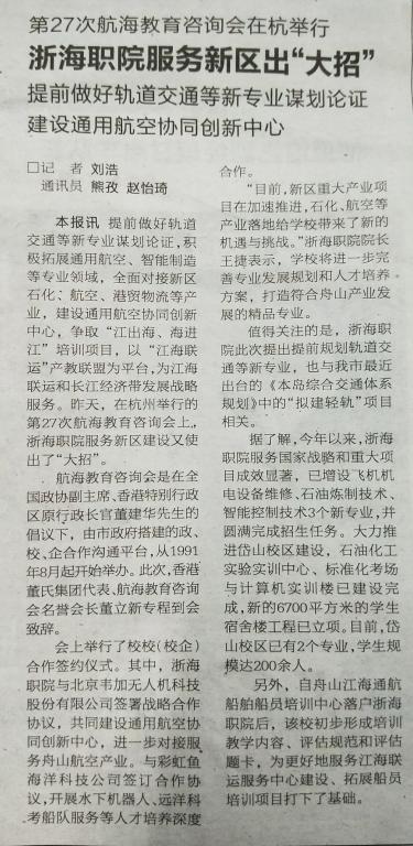 本报讯 提前做好轨道交通等新专业谋划论证,积极扩展通用航空、智能制造等专业领域,全面对接新区石化、航空、港贸物流等产业,建设通用航空协同创新中心,争取“江出海、海进江”培训项目,以“江海联运”产教联盟为平台,为江海联运和长江经济带发展战略服务。昨天,在杭州举行的第27次航海教育咨询会上,浙海职院服务新区建设又使出了“大招”。