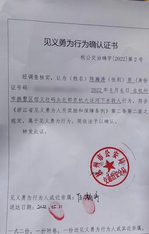 11日,根据《浙江省见义勇为人员奖励和保障条例》,其行为被确认为见义勇为。