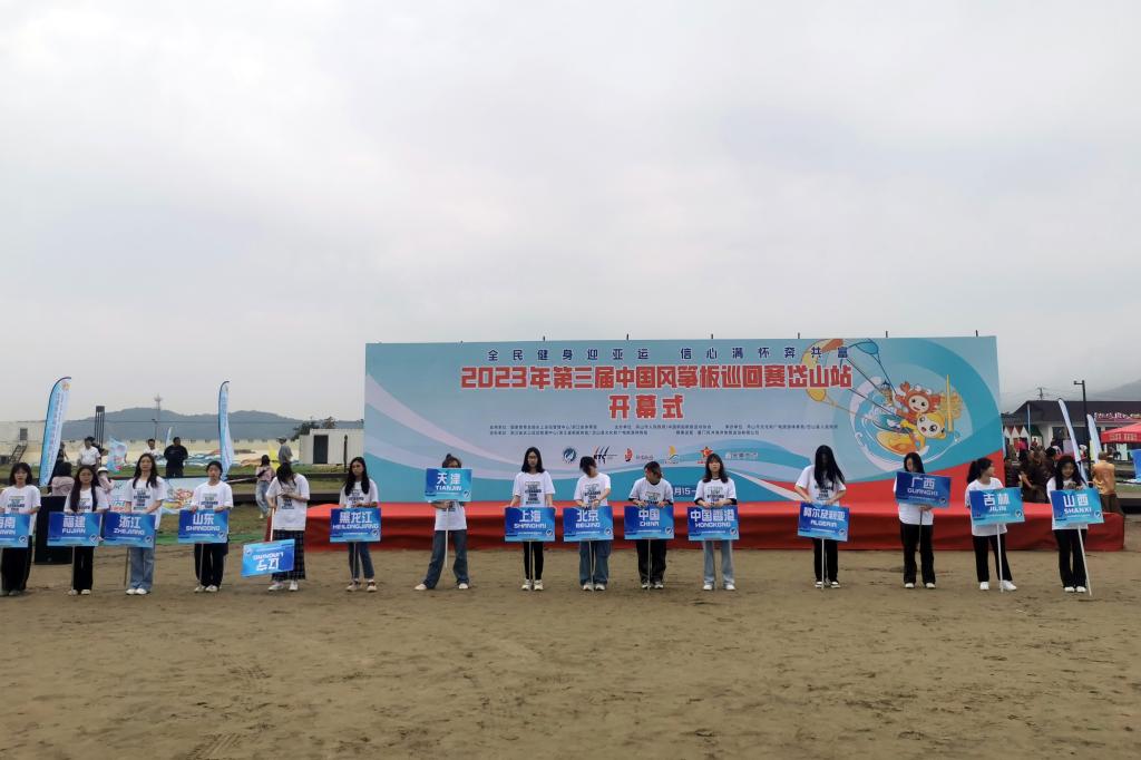 6月16日,2023年中国风筝板巡回赛岱山站在鹿栏晴沙开幕。赛事吸引了包括辽宁、北京、海南、湖南、四川、浙江、香港等地及阿尔及利亚的百余名专业运动员和风筝板爱好者,为确保比赛的顺利进行,石油化工学院的18名志愿者协助参加了开幕式。
