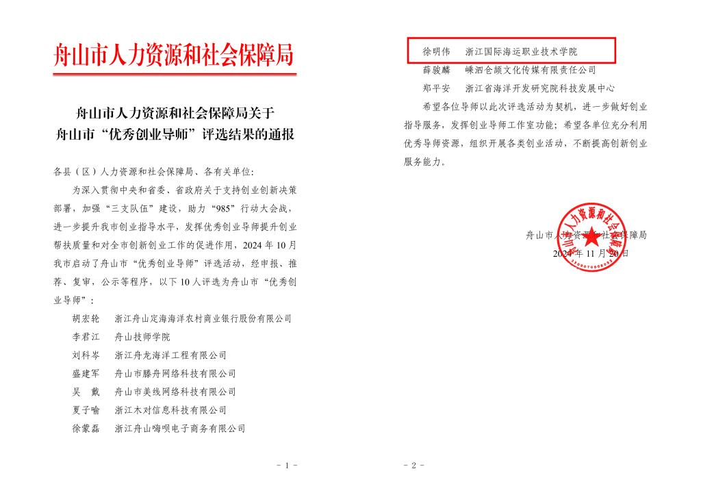 近日,舟山市人力资源和社会保障局公布2024年舟山市“优秀创业导师”评选结果。我校徐明伟老师在众多候选人中脱颖而出,荣获舟山市“优秀创业导师”称号,并在我校创业指导场地授牌成立“舟山市徐明伟创业导师工作室”。该工作室由市人社局给予一定工作经费用于创业导师工作室建设,支持创业导师下年度免费为创业者提供创业指导和服务。
